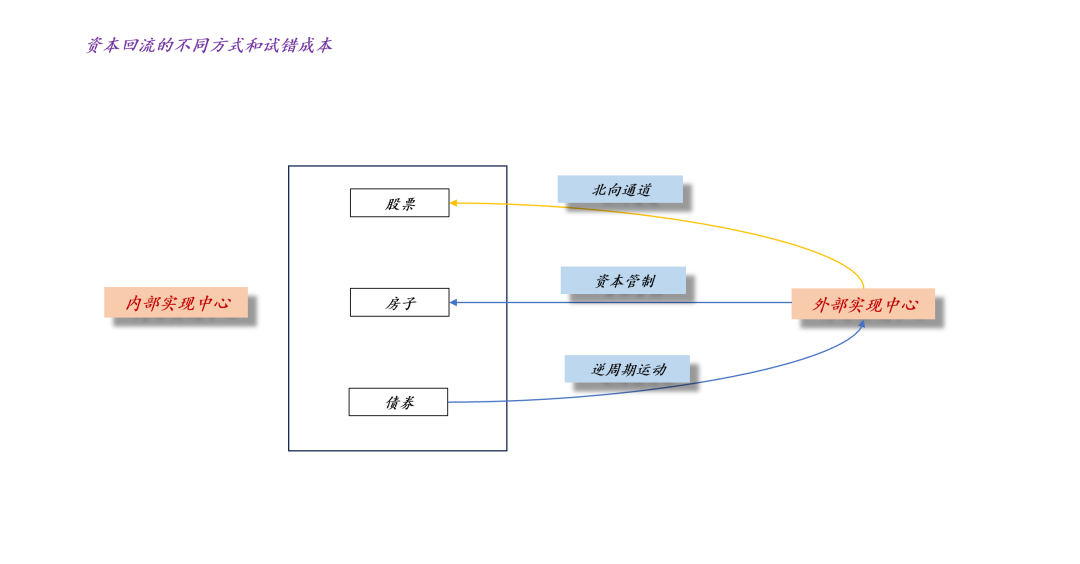 如上图所示,假设老王海外有一笔钱,他看到国内有复苏迹象,那么,他是结售汇回来买房,还是通过北向通道回来买股票呢??显而易见,是通过北向回来买股票。(ps:但是,楼市却没有北向通道啊)